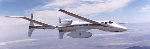 ![]() ![]() ![]() ![]() ![]() ![]() The Proteus is a unique aircraft designed for high-altitude, long-duration science or telecommunications missions. Designed by Burt Rutan and built by Scaled Composites at their Mojave, California, development facility, the Proteus features an unconventional tandem-wing, twin-boom configuration with two rear-mounted turbofan engines. Normally flown by two pilots in a pressurized cabin, the Proteus also has potential to perform its missions as an uninhabited air vehicle (UAV) flown remotely from the ground or autonomously. To that end, NASA's Dryden Flight Research Center is assisting Scaled Composites in development of a basic autopilot system and a SATCOM-based uplink/downlink data system for both aircraft and payload data under NASA's Environmental Research Aircraft and Sensor Technology (ERAST) program. Rutan's design allows for Proteus to be reconfigured for differing missions, such as telecommunications relay, atmospheric research, commercial imaging, and launch of small space satellites. The aircraft features modular construction, including a removable center-fuselage "barrel" that can carry the payload either internally or externally in a under-belly pod. Removable wingtip sections can be added or removed to tailor the Proteus' aerodynamics for various external payloads or for maximum altitude. The aircraft is designed to cruise at altitudes from 59,000 to more than 65,000 feet for up to 18 hours.